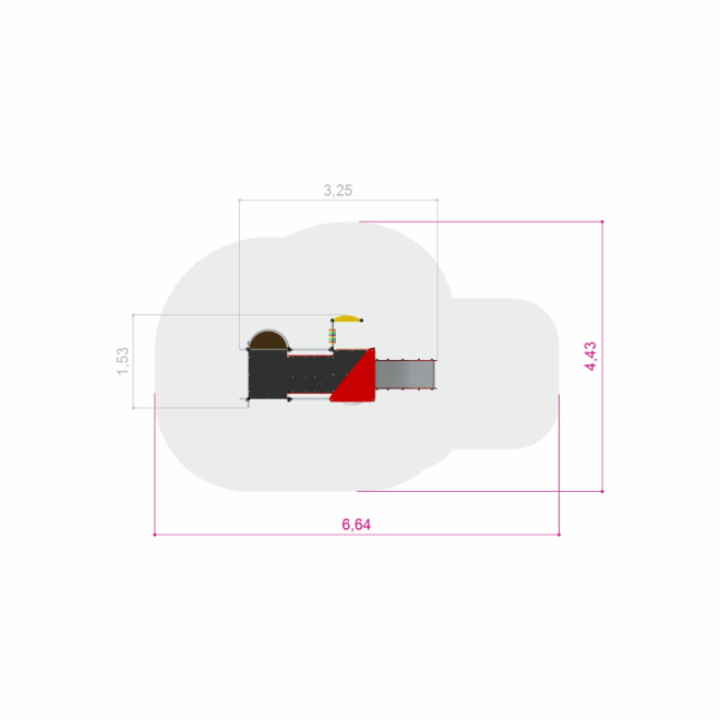 Hrací plocha je navržena s ohledem na bezpečnost dětí, s maximální výškou 213 cm a platformami ve výškách 30 a 55 cm. Kritická výška pádu nepřesahuje 55 cm, což minimalizuje riziko úrazů. Doporučuje se instalace na vhodný dopadový povrch, který splňuje normy pro dětská hřiště. Tento výrobek je vhodný pro děti od jednoho roku věku.
